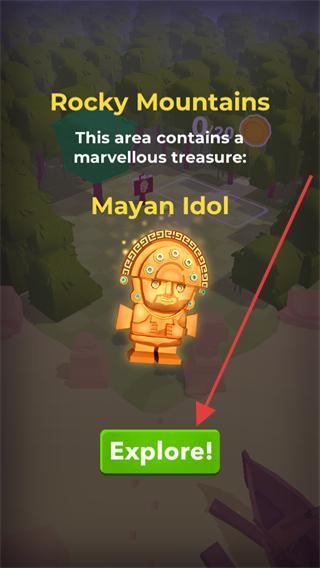 1、進入游戲看到帶有Explore按鈕的界面,點擊該按鈕進入叢林尋寶場景,操控角色開始在叢林中移動,準備尋找寶物和收集金幣。