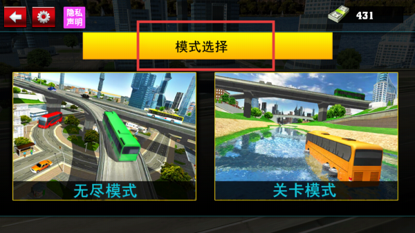 2、玩家進入之后點擊模式選擇,可以選擇無盡模式或關卡模式,無盡模式下可無限制地進行駕駛挑戰。