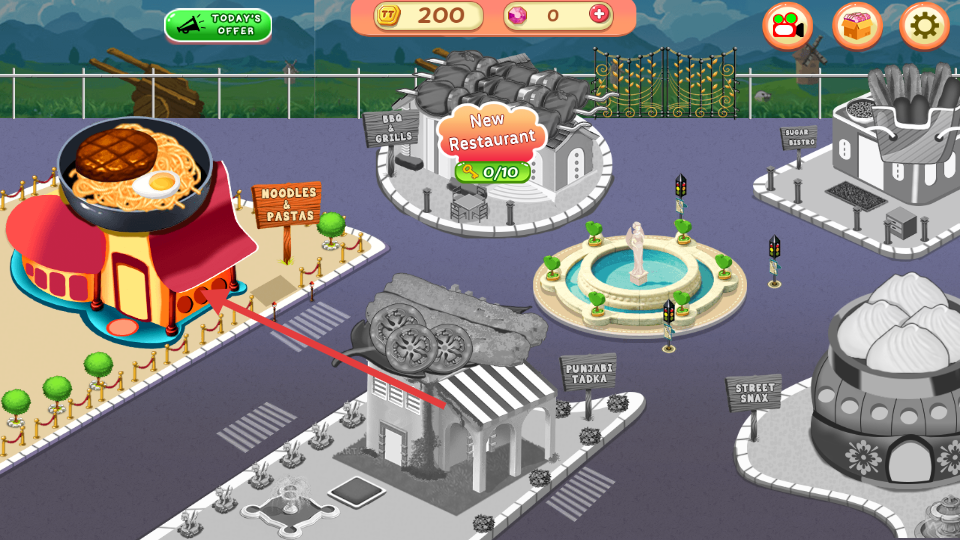 1、進入游戲關卡界面,點擊帶有面條和煎蛋圖案的餐廳建筑,可進入該餐廳的游戲界面,開啟與面條、意面相關的經營或制作任務。