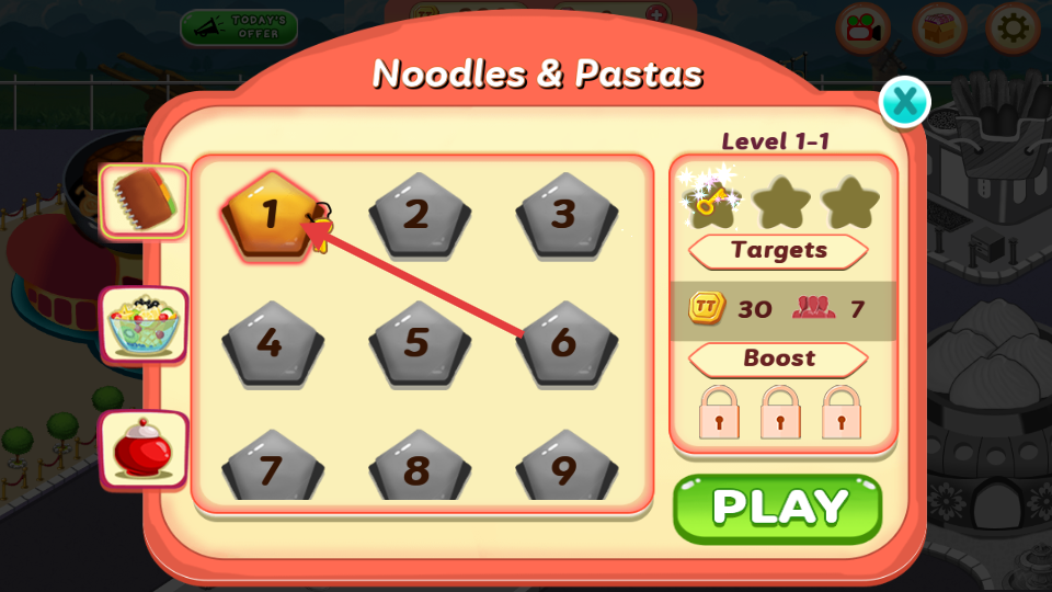 2、進入Noodles或Pastas界面后,玩家選擇標有1的關卡,其他關卡處于未解鎖狀態,需要按順序逐漸解鎖,再點擊綠色PLAY按鈕,即可開始第一關的游戲挑戰。