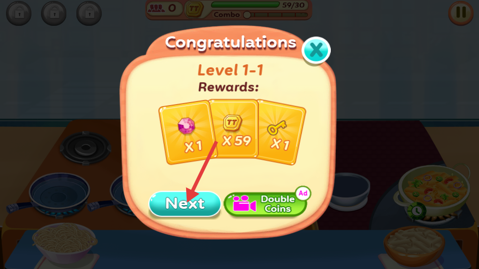4、成功通過關卡1后,會彈出獎勵界面,玩家會獲得寶石、金幣和鑰匙獎勵,點擊Next按鈕可進入下一關,可以繼續游戲挑戰。