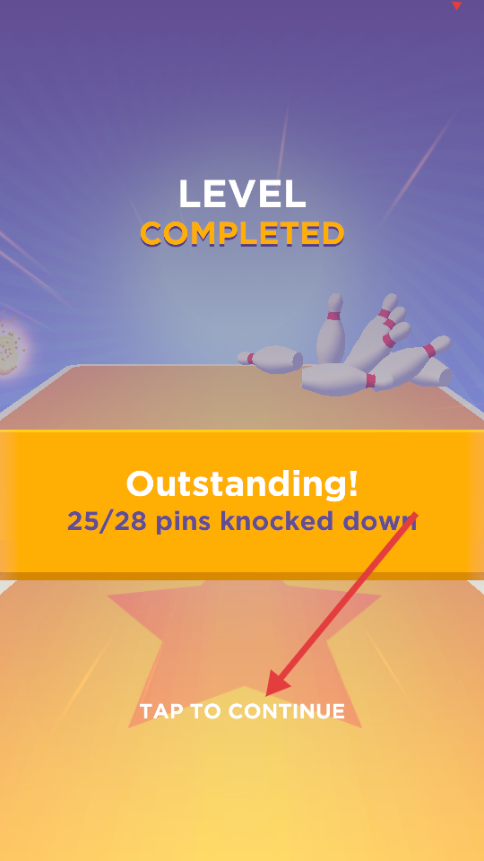 4、成功擊倒一定數量的保齡球瓶后,關卡顯示LEVEL COMPLETED,點擊TAP TO CONTINUE,即可繼續挑戰下一關,開啟新的保齡球挑戰。