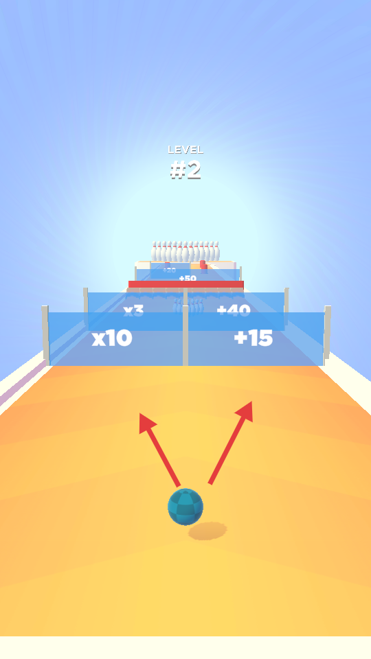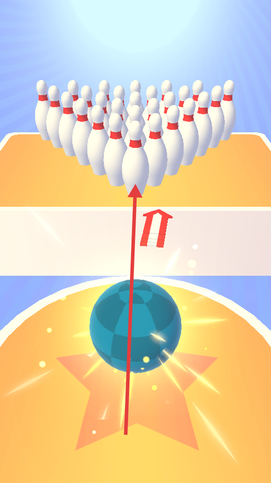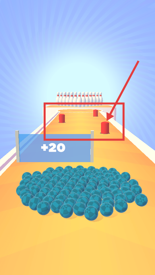 2、讓藍色球持續前行,注意避開紅色圓柱障礙,同時利用之前獲取的增益效果,使球的數量或威力提升,朝著保齡球瓶方向前進。