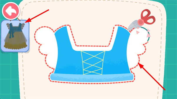 2、參照左側展示的服飾樣式,使用剪刀沿著虛線裁剪布料,得到對應形狀的裁片,推進服飾制作的裁料步驟。