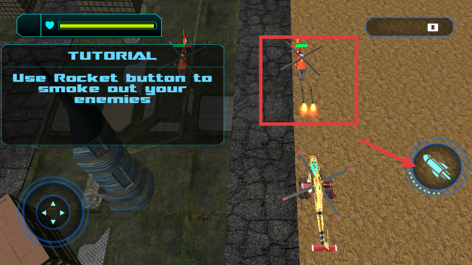 3、遇到敵方直升機時,點擊右側火箭按鈕,發射火箭攻擊敵人,利用該技能清除敵方目標,推進游戲任務進程。
