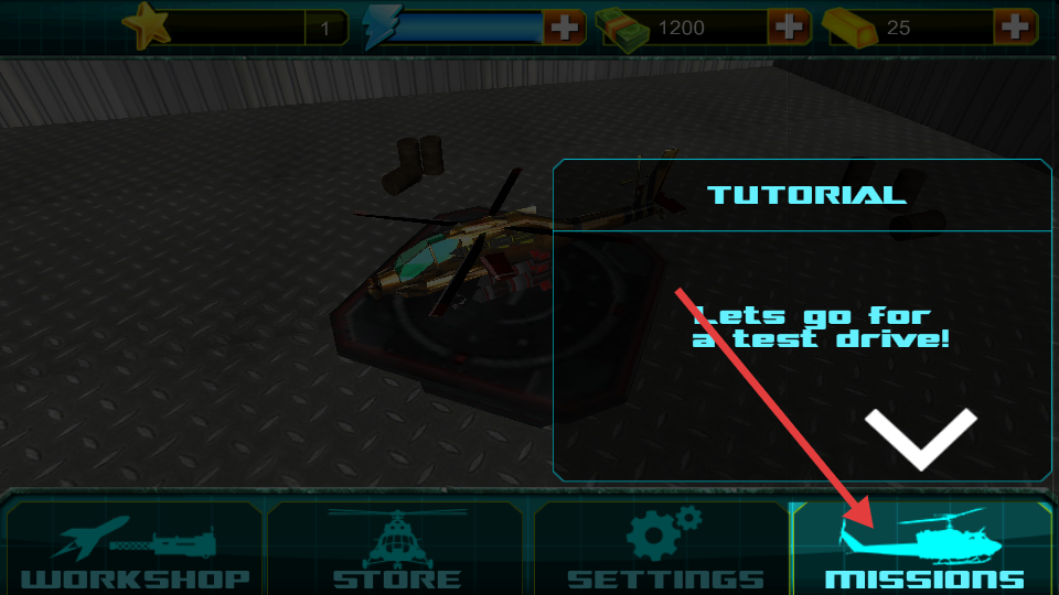 1、進入游戲點擊MISSIONS按鈕開啟任務,玩家可以先進行試飛,熟悉直升機操作,為后續執行任務做好準備。