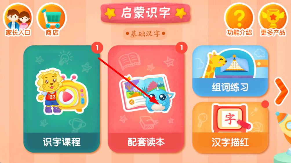 1、進入啟蒙識字主界面,可看到識字課程配套讀本等功能模塊,選擇配套讀本選項,進入對應板塊,開啟漢字相關的讀本學習內容。