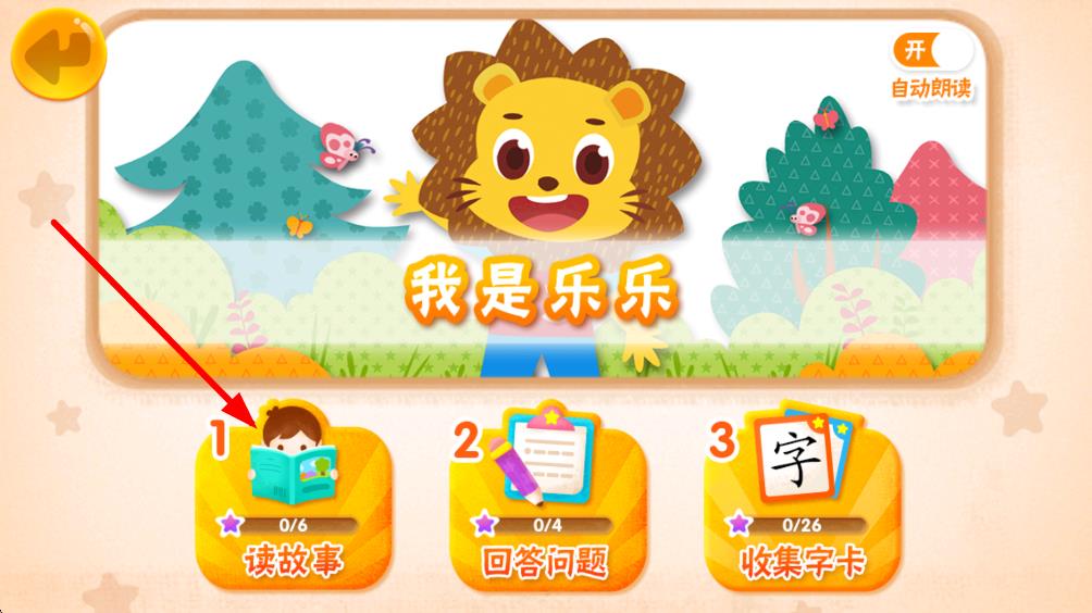 3、進入讀本學習界面,可看到讀故事、回答問題、收集字卡等功能按鈕,先點擊讀故事按鈕,開啟對應的故事閱讀學習內容。