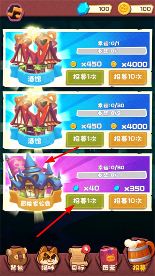 3、進入招募界面,可選擇酒館或冒險家公會等渠道,消耗資源點擊招募按鈕,獲取新的隊員來擴充隊伍。