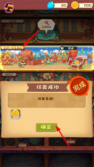 4、任務完成后會彈出任務成功界面,點擊確定按鈕領取獎勵,結束本次任務流程,繼續推進后續的冒險內容。
