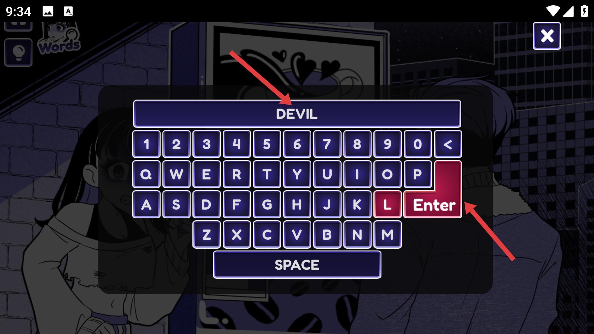 3、當彈出鍵盤界面時,按順序輸入【DEVIL】,輸入完成后,點擊紅色的【Enter】鍵,完成輸入操作,觸發咖啡機的相應反應。