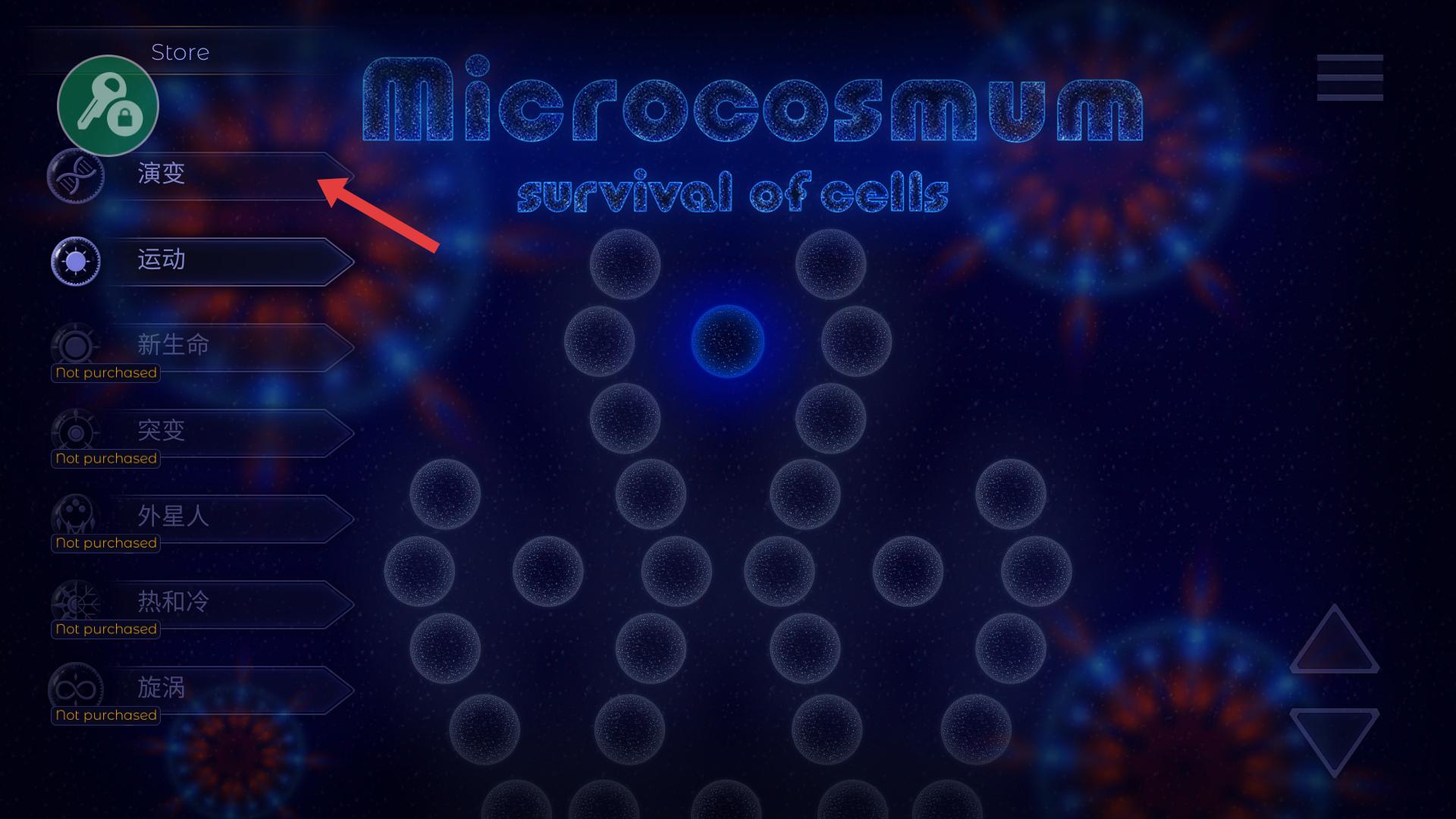 1、游戲初始界面,點擊演變選項,可進入相關功能界面,開啟細胞演變相關的游戲內容,探索細胞在演變方面的發展,為后續細胞生存和競爭做準備。