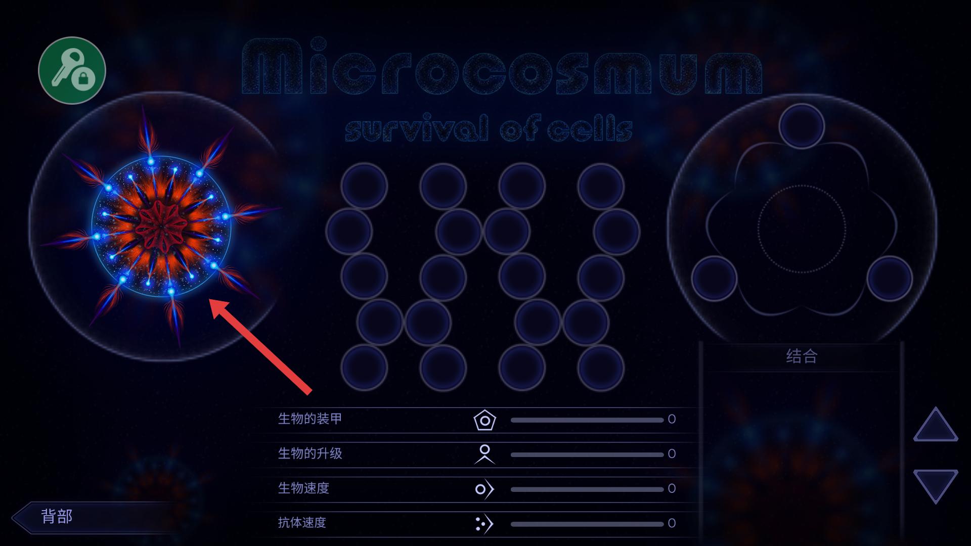 2、進入細胞設置界面,可查看生物的裝甲、升級、速度等屬性,根據游戲需求,合理規劃這些屬性的提升,增強細胞的能力,讓細胞在后續生存中更具優勢。
