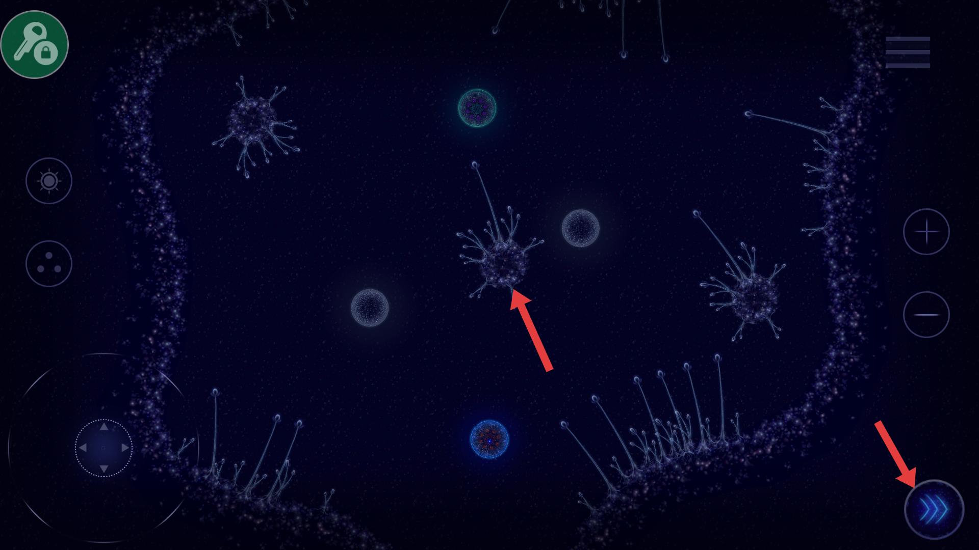 3、在細胞生存場景中,操控細胞移動,躲避其他細胞的攻擊,同時尋找機會,點擊右側加速按鈕,快速移動細胞,搶占資源或到達安全區域,提升細胞生存概率。