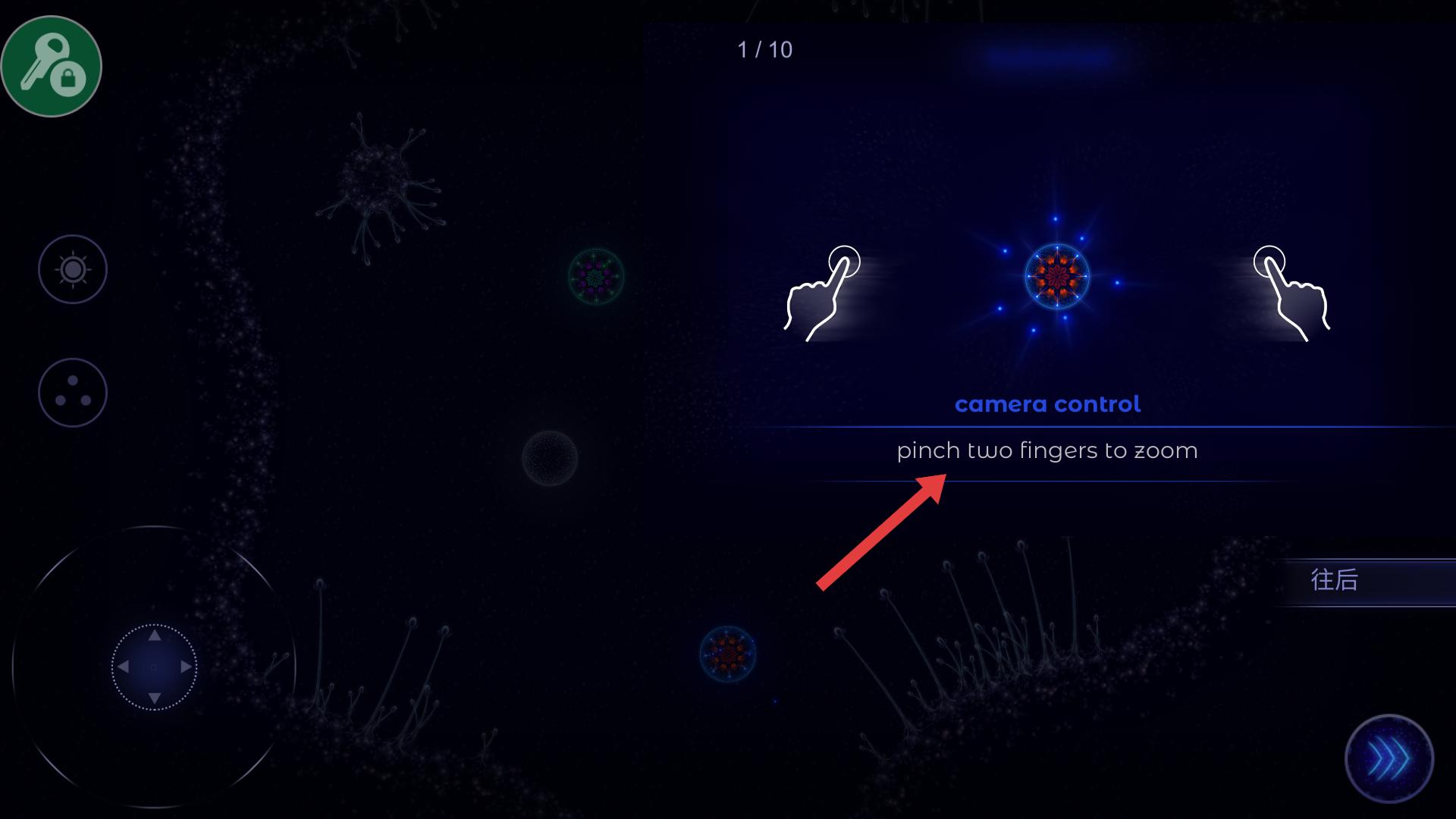 4、游戲提示可通過兩指捏合來縮放視角,利用該操作,調整畫面視角,更清晰地觀察細胞周圍環境,便于操控細胞,更好地進行細胞生存和競爭的游戲操作。