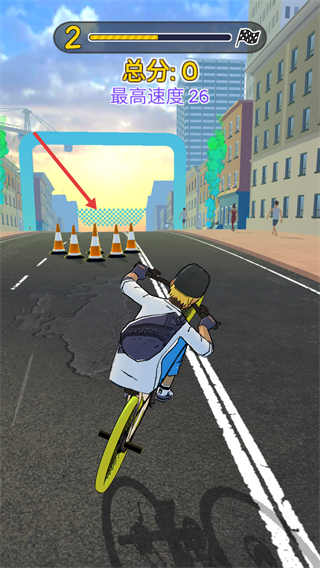 3、在騎行過程注意前方道路上的各種障礙,如車輛、交通錐等,及時做出反應躲避它們,朝著終點線沖刺。
