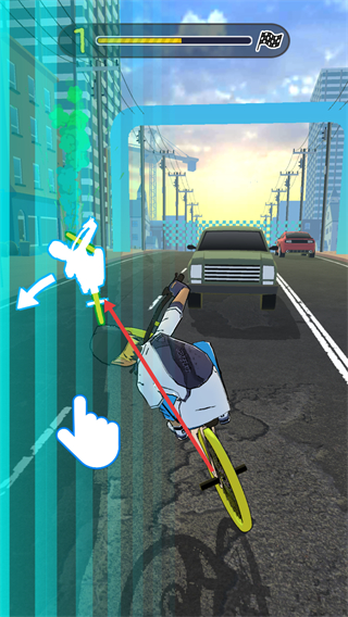 1、進入游戲后根據屏幕上的手勢提示操控自行車少年騎行,比如通過滑動或點擊屏幕來控制方向和動作。