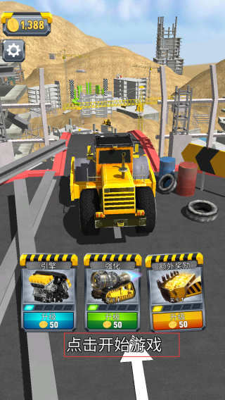 1、玩家下載游戲之后在游戲主界面,點擊圖標點擊開始游戲區域,駕駛工程車進入游戲場景。