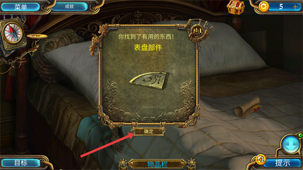 3、在場景里可找到有用的表盤部件,找到后點擊確定收集,這些部件可用于后續解謎操作。