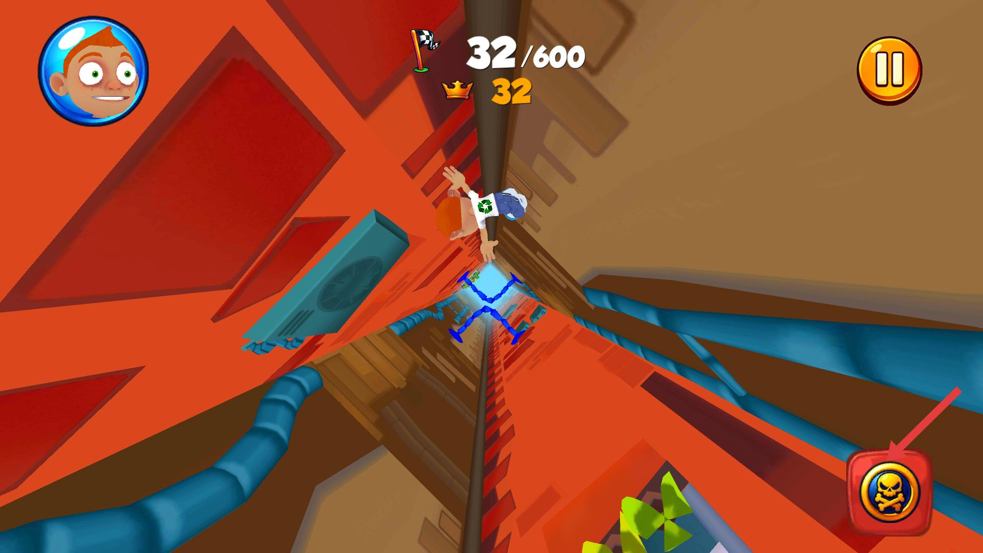 3、當下落到紅色場景的通道時,繼續靈活操控角色,躲避各類障礙,還可利用右下角的功能按鈕,助力游戲進程。