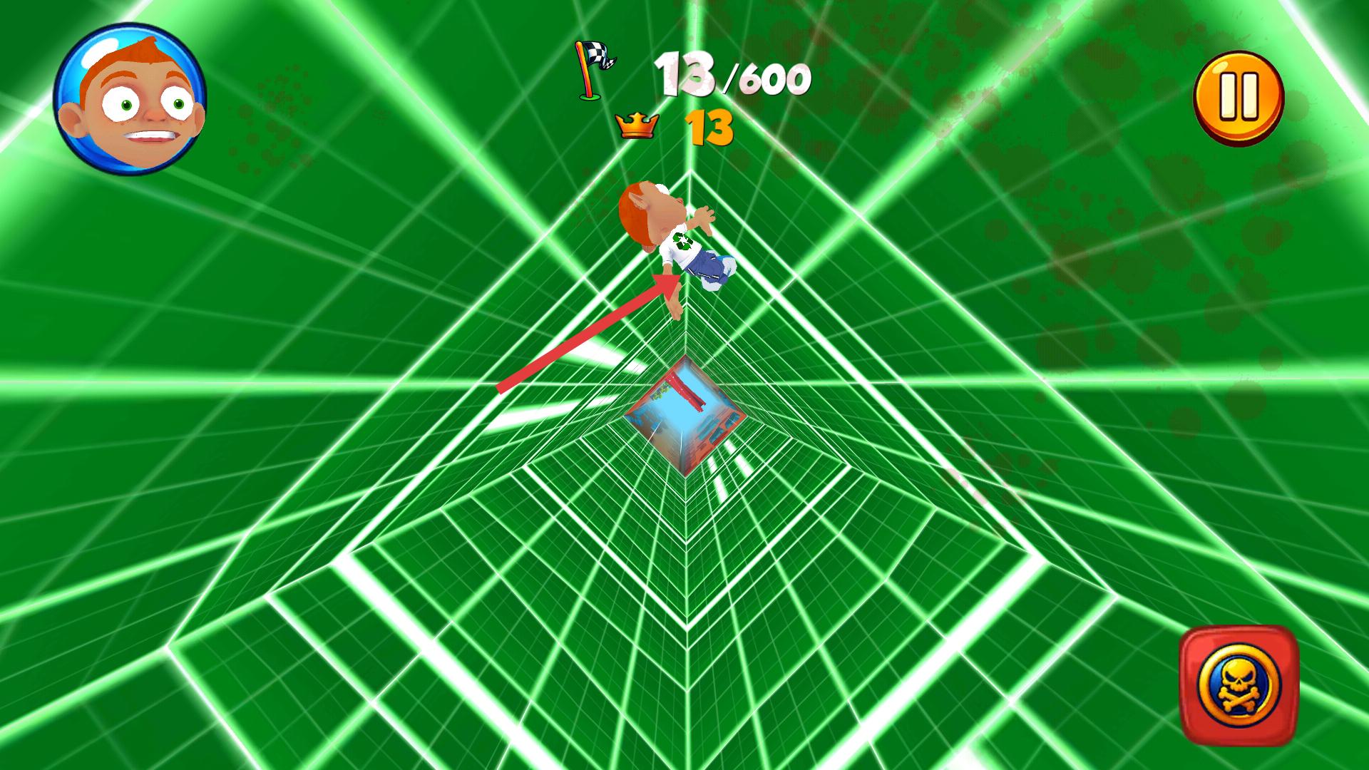 2、操控角色在綠色網格狀的下落通道里移動,避開障礙物,同時留意上方的進度和得分,不斷向下探索。