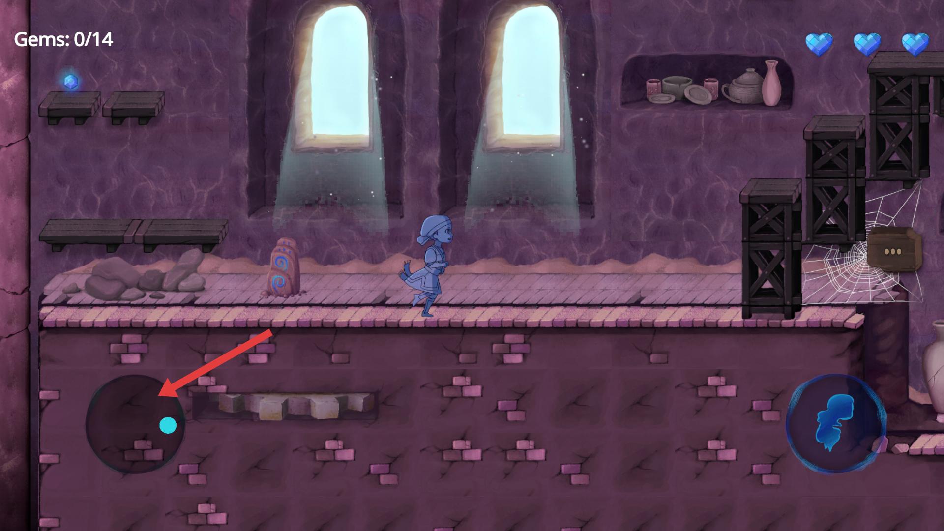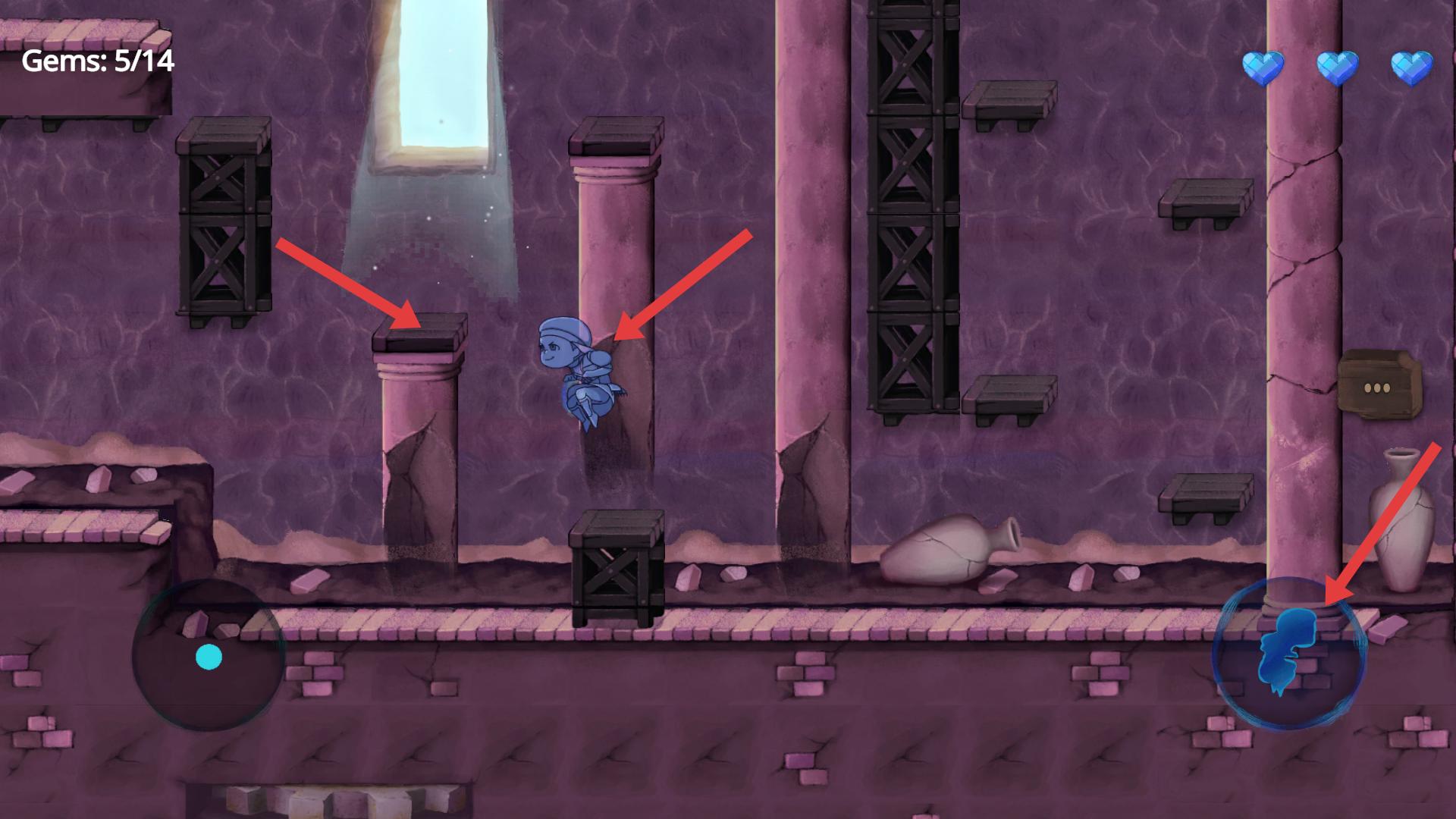 1、基礎移動控制:左屏虛擬搖桿控制水平移動,右側按鈕觸發跳躍,長按可增加跳躍高度,空中二次點擊實現墻體踢跳延伸探索范圍。