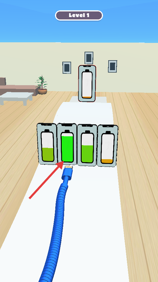 1、游戲開始點擊Tap To Play,操控藍色充電線前進,前方有不同電量的電池要收集電能,為后續給手機充電做準備。