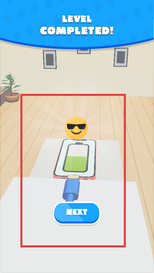 4、成功為手機充上電后,屏幕顯示LEVEL COMPLETED,此時點擊NEXT,即可進入下一關,繼續新的充電挑戰。