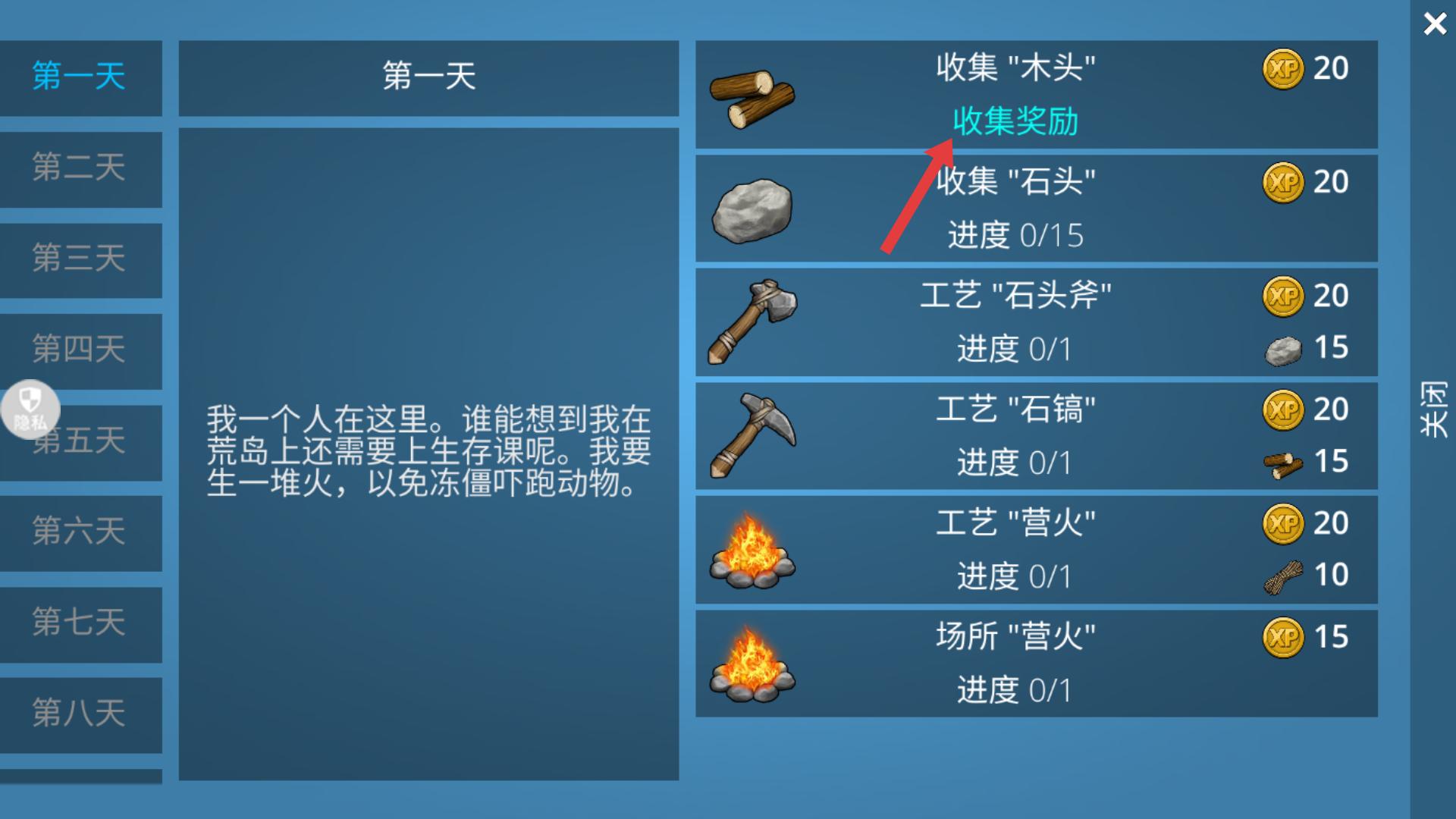 4、完成收集木頭等任務后,可查看收集獎勵,獲取經驗等,還能繼續推進第二天及后續的生存任務,提升生存能力。