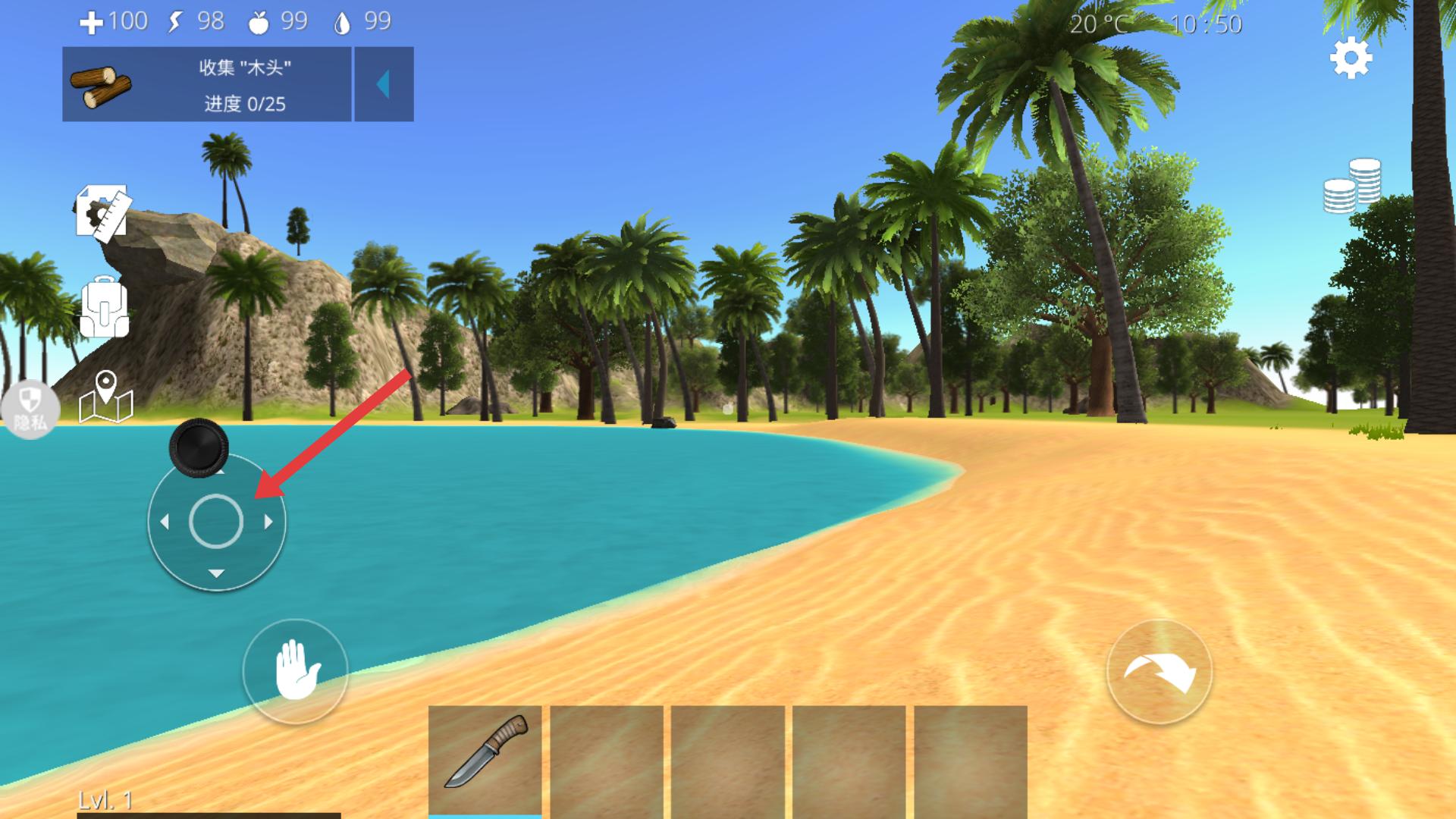 2、進入游戲后,通過左側虛擬搖桿操控角色在沙灘、樹林等區域移動,探索環境,尋找可利用的資源。