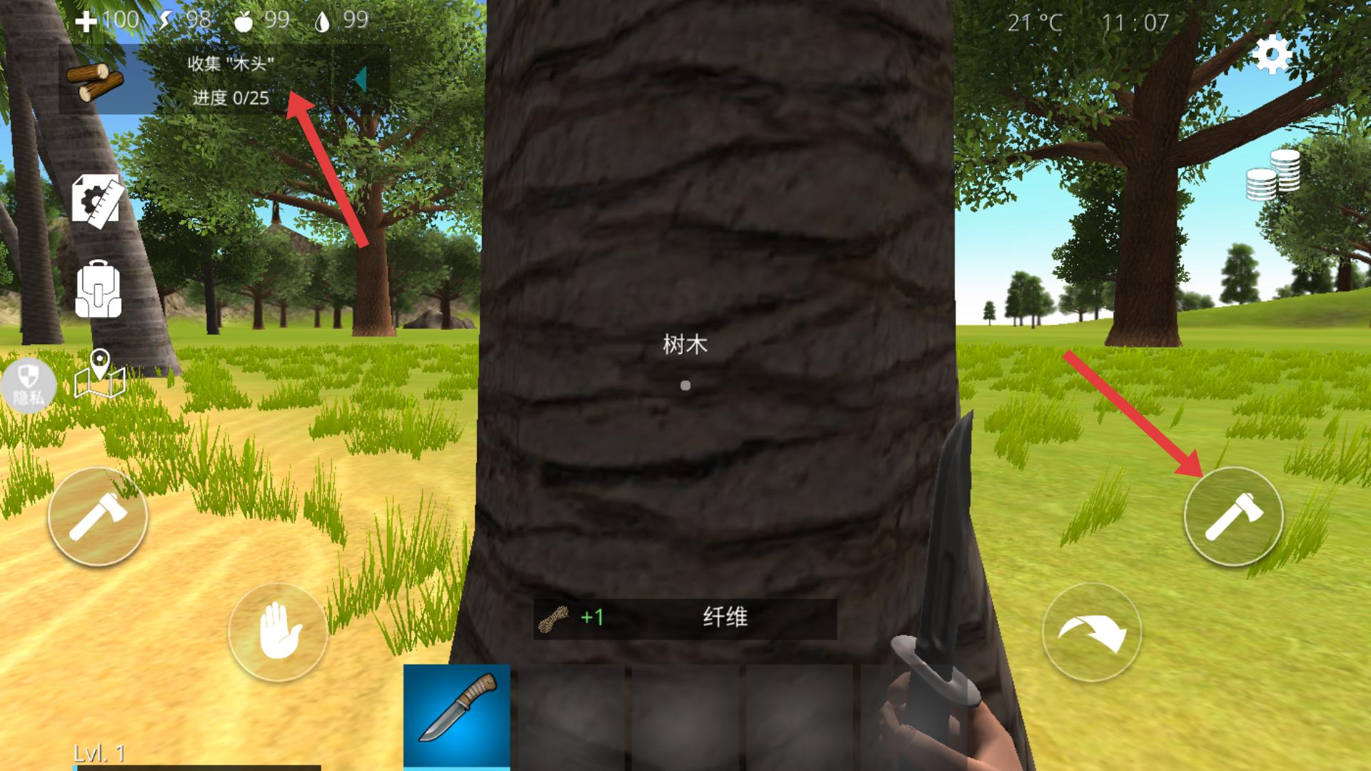 3、遇到樹木時,點擊右側斧頭圖標,可砍伐樹木,獲取木頭資源,同時留意左上角收集木頭的任務進度,逐步完成。