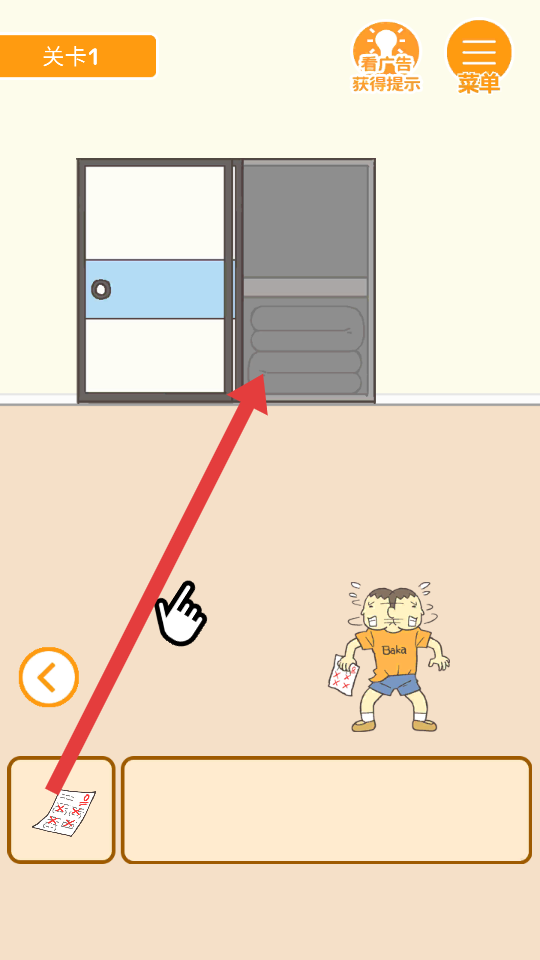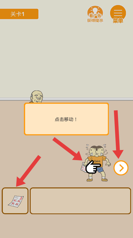 1、進入游戲關卡,根據提示點擊移動,操控角色在場景里行動,為試卷尋找合適的躲藏位置。