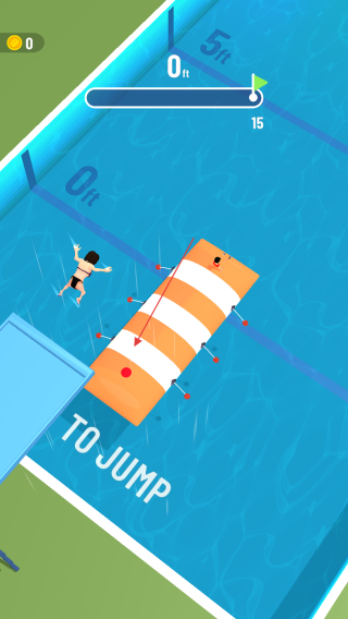 2、點擊屏幕使人物從跳水臺跳下,控制跳躍的角度和力度,盡量讓人物準確落在水中的浮具上進行彈跳。