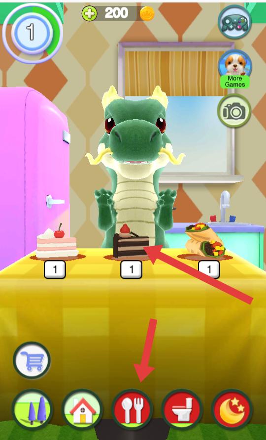 1、在餐桌場景,點擊下方帶餐具圖標,選擇桌上蛋糕,萌龍會進行進食互動,體驗喂養樂趣。