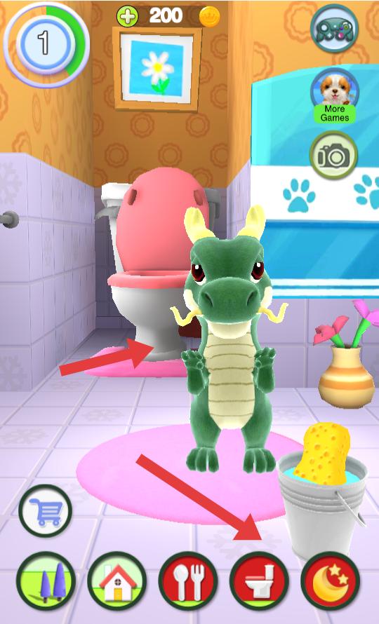 2、進入衛生間場景,點擊下方馬桶圖標,萌龍會靠近馬桶,配合水桶道具,可開展清潔等互動。