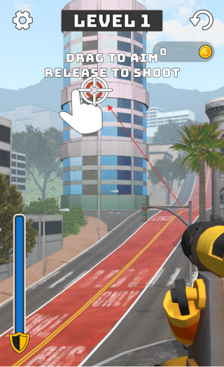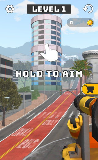 1、在游戲界面看到提示HOLD TO AIM,按住屏幕即可開始操控加農炮進行瞄準,對準需要拆除的目標建筑。