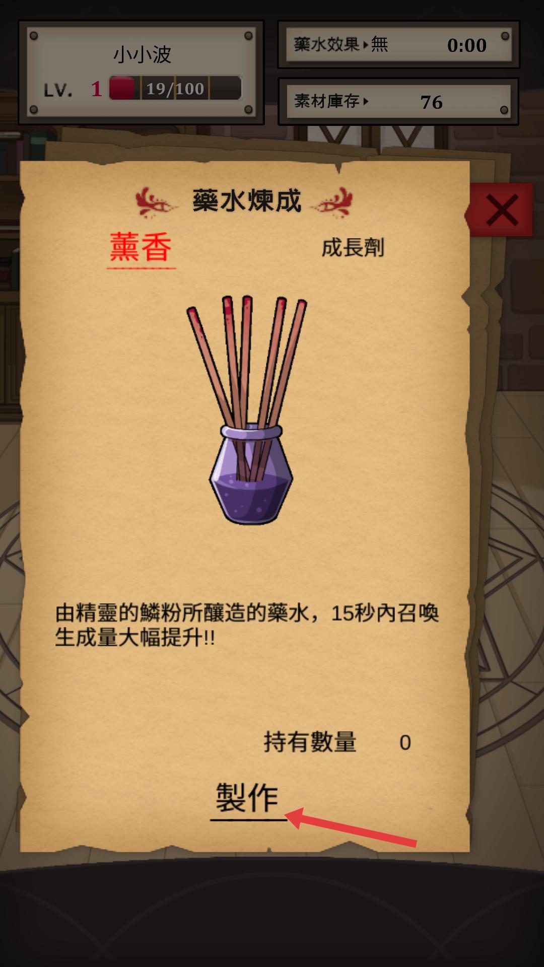 4、在藥水煉成界面,選擇薰香藥水,點擊制作按鈕,制作該藥水,借助其效果,在15秒內大幅提升召喚生成量。