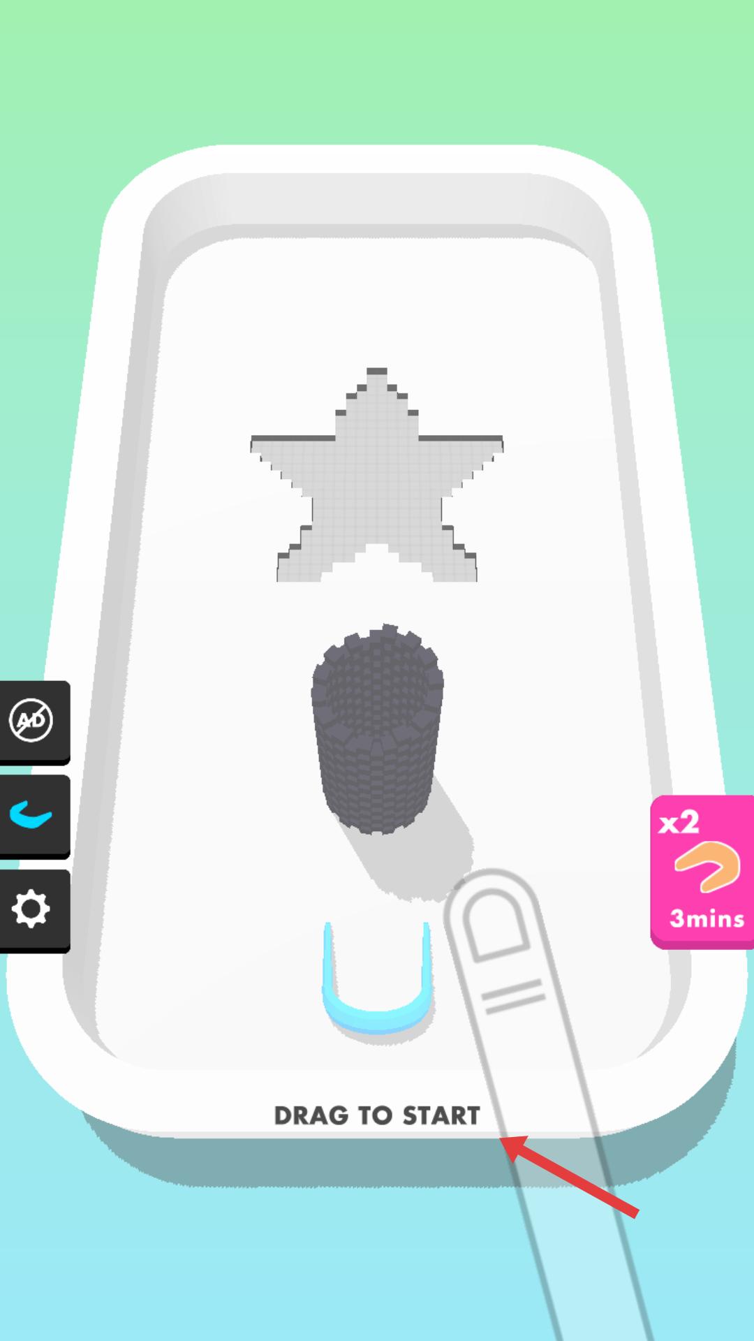 1、游戲開始,按照提示拖動藍色部件,讓黑色顆粒填充星形輪廓,開啟造型制作,熟悉初始操作流程。