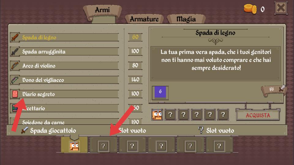 3、進入武器界面,瀏覽武器列表,選定想要的武器,點擊對應Slot vuoto裝備,或點ACQUISTA購買。