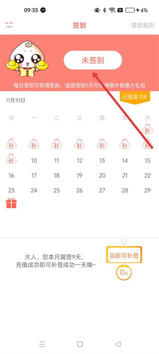 3、簽到頁面可看到每日簽到狀態,連續簽到5天可獲額外大禮包,還可查看本月簽到情況,了解補簽規則。