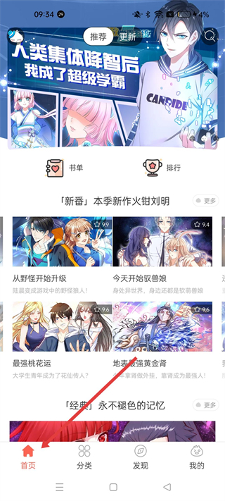 1、進入首頁可看到推薦的漫畫,還有書單、排行功能入口,以及新番、經典等板塊的漫畫推薦,可瀏覽或選擇漫畫閱讀。