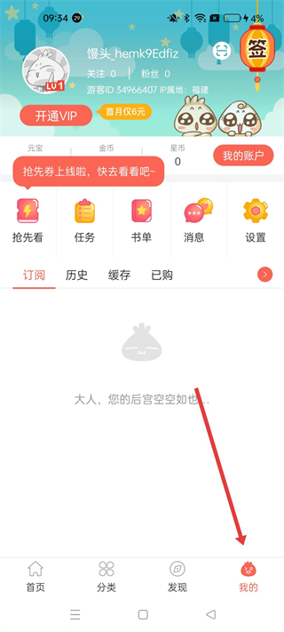 2、點擊我的進入個人頁面,能看到用戶信息、開通VIP入口,還有搶先看、任務、書單等功能選項,可管理個人漫畫相關事務。