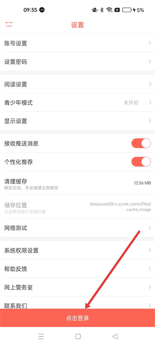 4、進入設置頁面,能看到賬號設置、閱讀設置、青少年模式等功能選項,可對APP進行個性化設置,底部有點擊登錄入口。