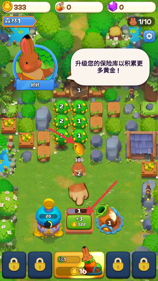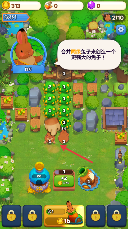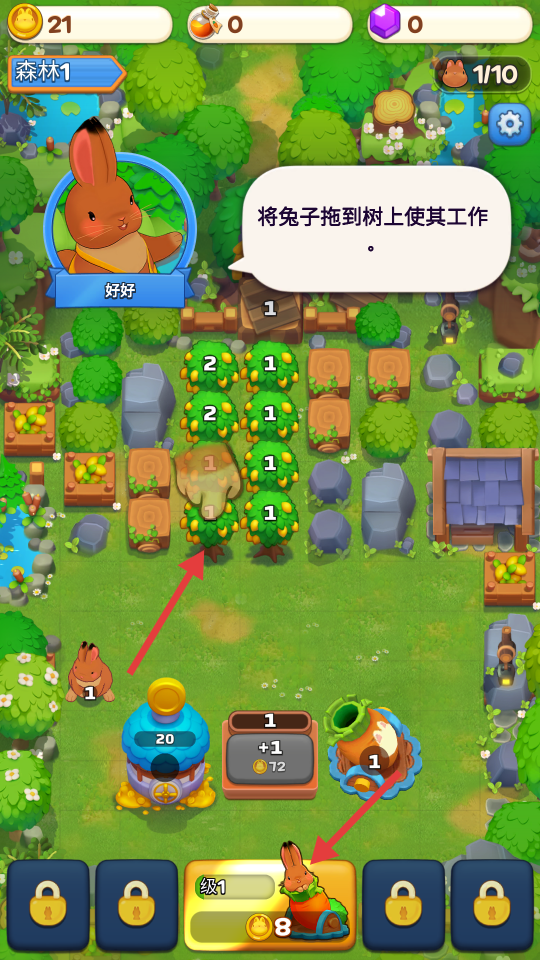 1、玩家可以按照提示,用硬幣召喚兔子,再把兔子拖到樹上,兔子就會開始工作,這樣能獲取金幣等資源,助力游戲游戲進程。