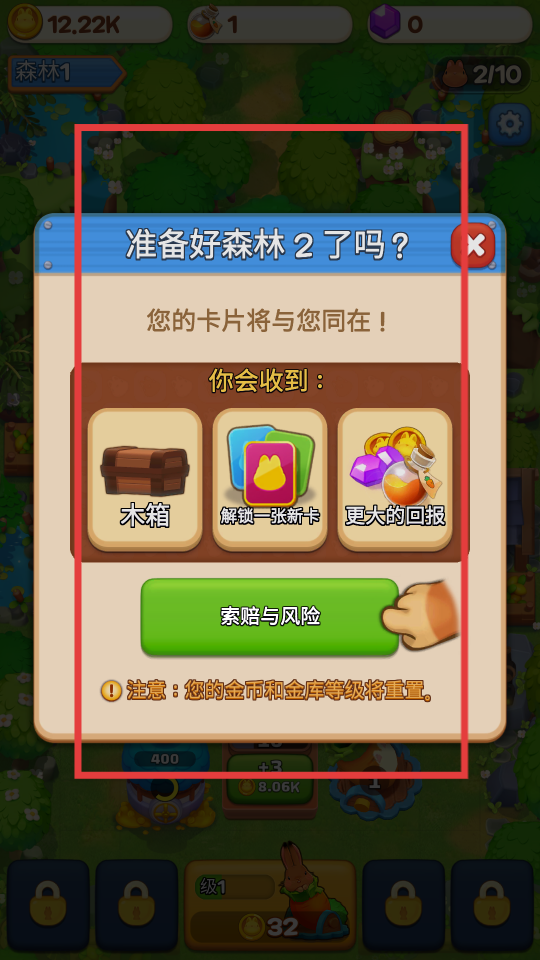 4、成功到達最深處的兔子洞,當準備進入森林2時,點擊索賠與風險會獲得木箱、新卡和更大回報,但金幣與金庫等級會重置。