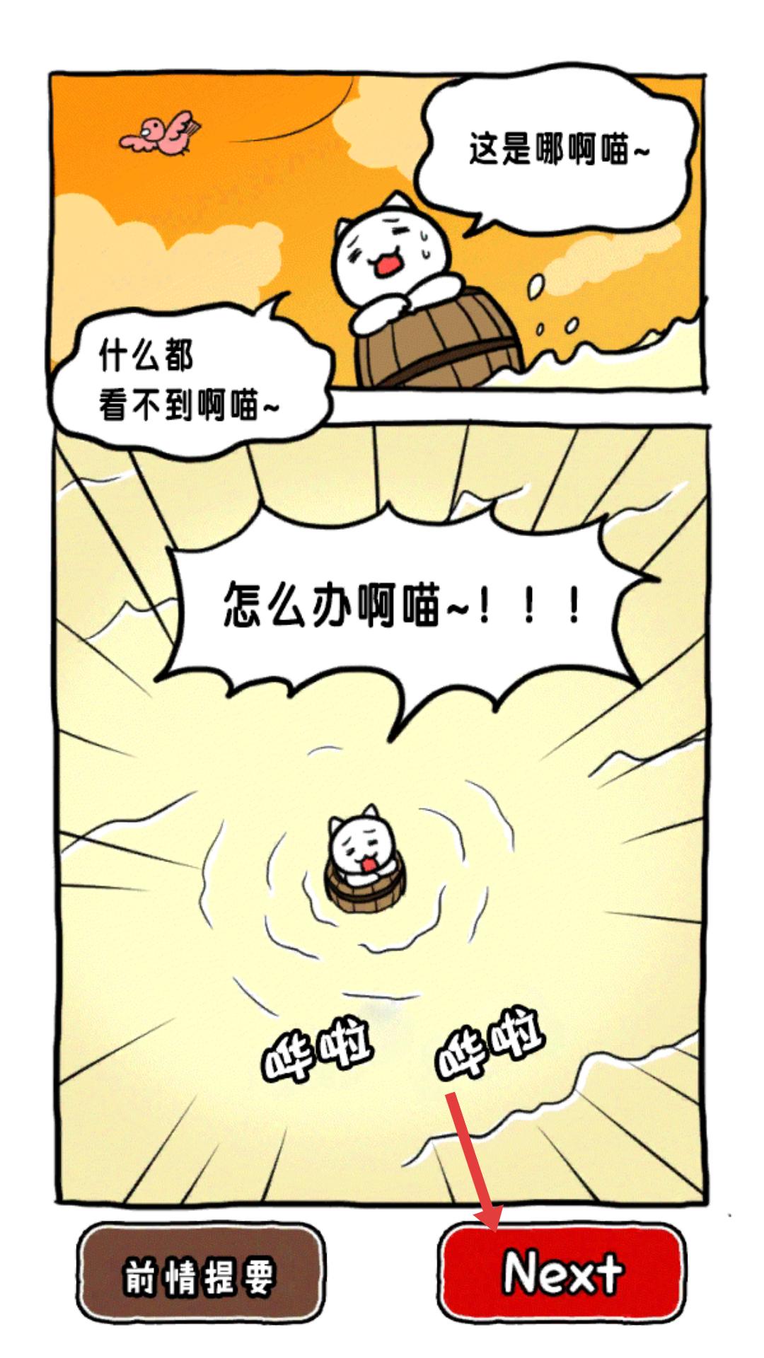 2、進入劇情界面,展示貓咪在木桶里的情景,點擊Next按鈕,推進劇情發展,了解后續故事,為解謎和冒險做準備。