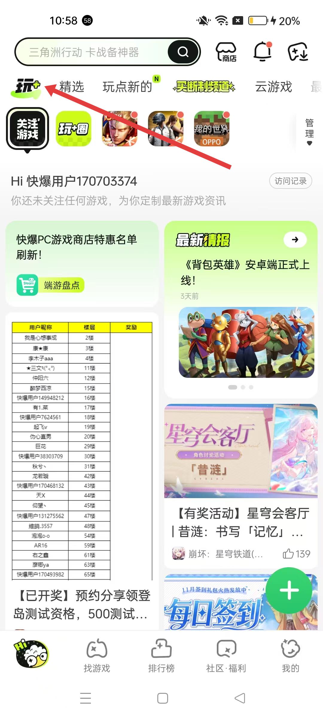 2、頁面上方找到玩加板塊,點擊進入,可查看最新游戲資訊、參與社區活動等。