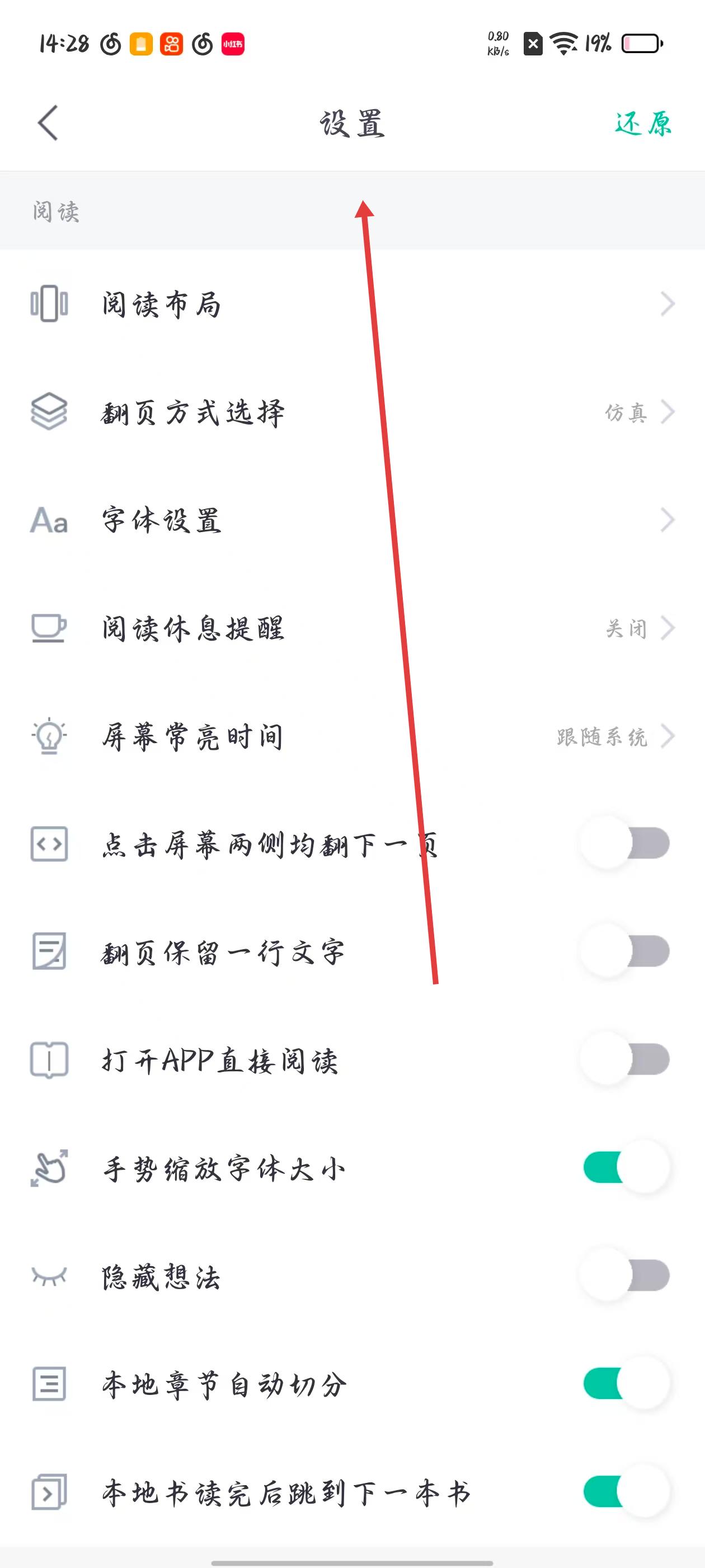 4、進入設置頁面,調整閱讀布局、翻頁方式、字體設置等閱讀相關選項,優化閱讀體驗。