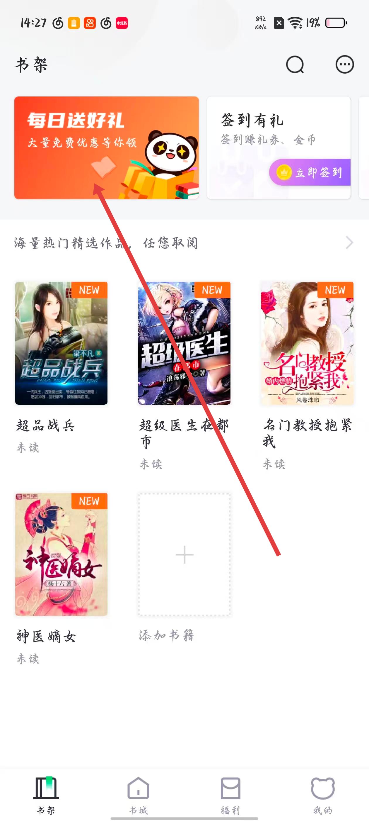 1、進入軟件書架頁面,點擊每日送好禮區域,領取大量免費優惠,參與軟件福利活動。