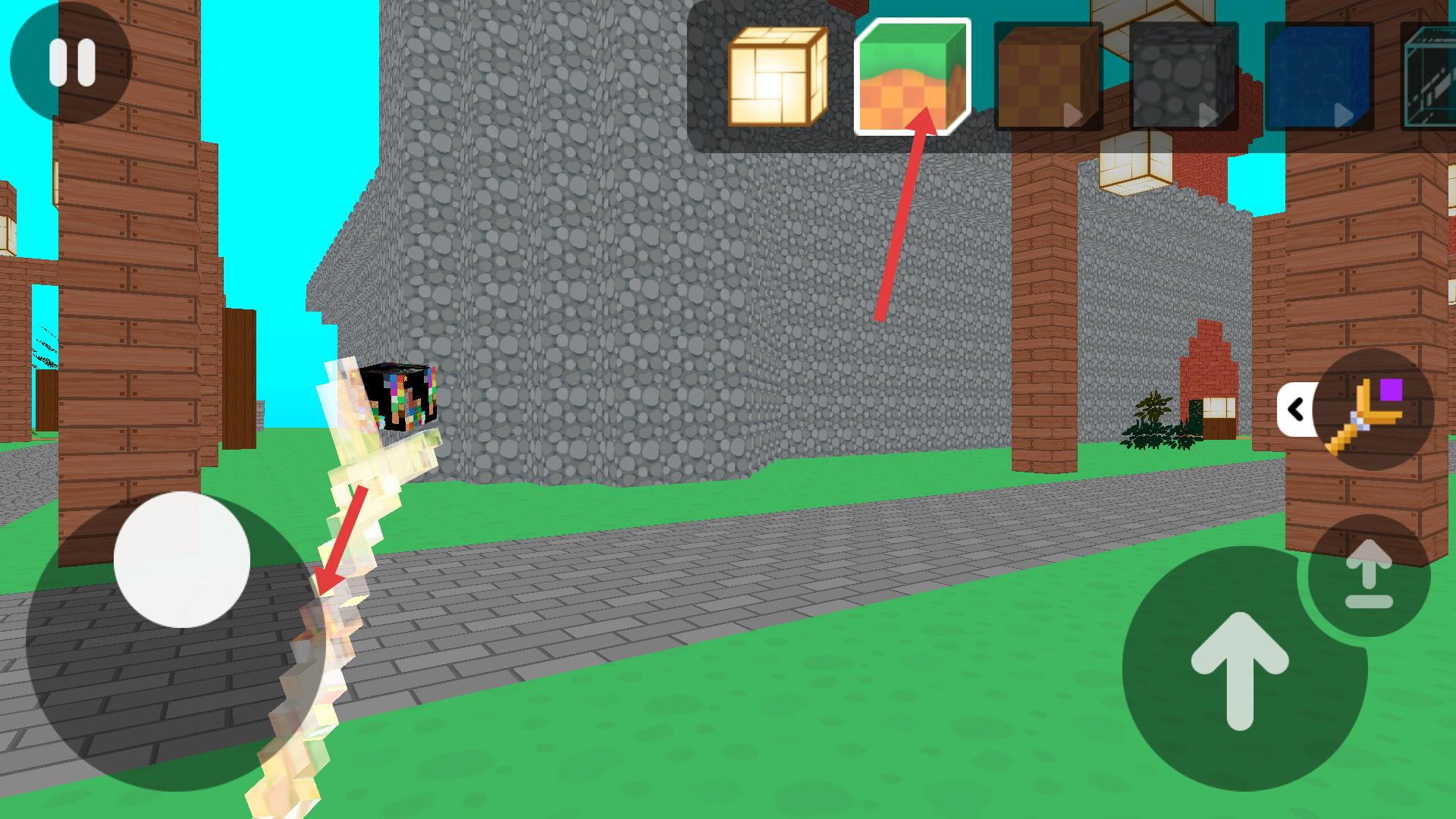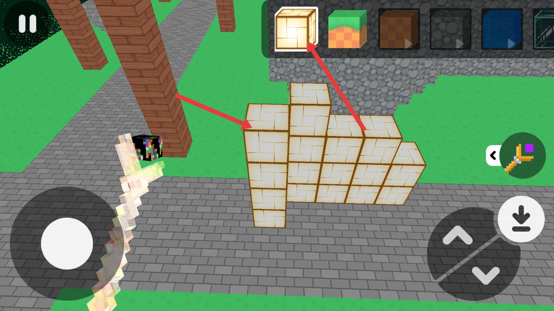 2、進入游戲場景后,界面上方有不同方塊可選,先選擇草地方塊,然后在地面合適位置進行放置,搭建基礎。